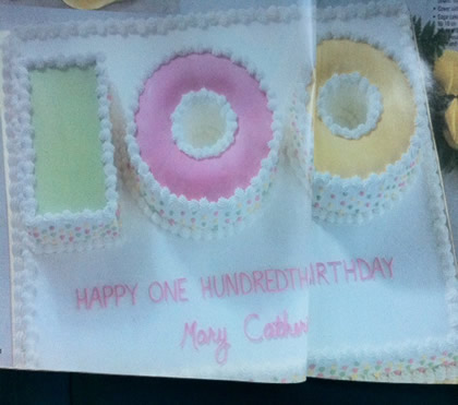 100 years! Sitting atop a sheet cake to serve 100. Could that be any